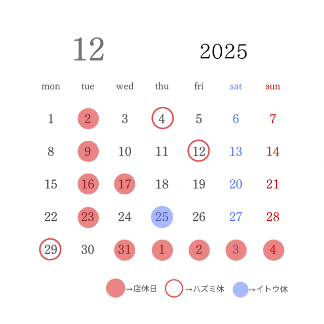 【12月と年末年始の店休日、スタッフ休のお知らせ】